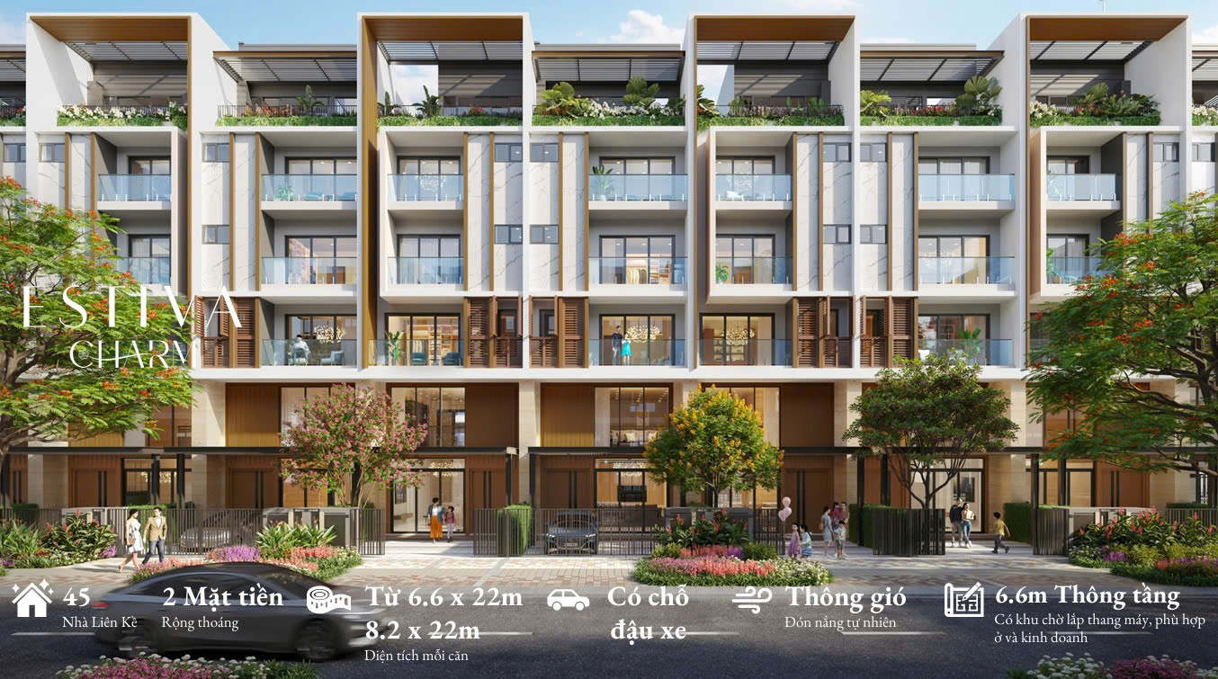 Đặc biệt, các sản phẩm nhà liền kề và shophouse tại Estiva Charm được thiết kế 2 mặt tiền, tối ưu công năng, phù hợp vừa ở vừa kinh doanh. Không gian sống mở, thông thoáng, kết hợp kiến trúc hiện đại mang lại trải nghiệm sống “resort tại gia” ngay trong lòng đô thị.