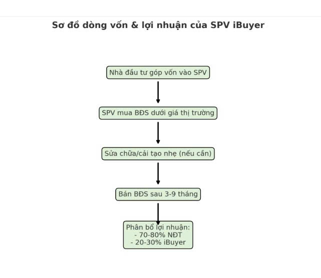 Sơ đồ dòng vốn & lợi nhuận của một SPV iBuyer: từ lúc nhà đầu tư góp vốn → SPV mua BĐS → cải tạo → bán → phân chia lợi nhuận cho NĐT và iBuyer